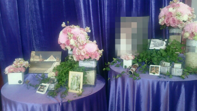 会場の入り口の前には前撮り写真と前撮り写真をプリントした
